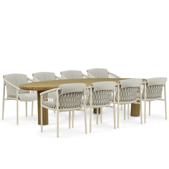 Breng een moderne en luxe sfeer naar jouw tuin met de 4 Seasons Outdoor Allora diningstoelen in de kleur Latte en de volledig teakhouten Leafline dining tuintafel. Deze royale 9-delige tuinset is perfect voor grote gezelschappen en sfeervolle diners. De Allora diningstoelen, met hun slanke aluminium frame en rope zit- en ruggedeelte, sluiten perfect aan bij de ruime en robuuste Leafline dining tuintafel. Dankzij het gebruik van hoogwaardige materialen zoals aluminium, rope en teakhout is deze set niet alleen stijlvol, maar ook duurzaam en bestand tegen diverse weersomstandigheden. Kom proefzitten en ontdek deze luxe tuinset in een van onze 12 Tuinmeubelshop XXL Experience Stores!