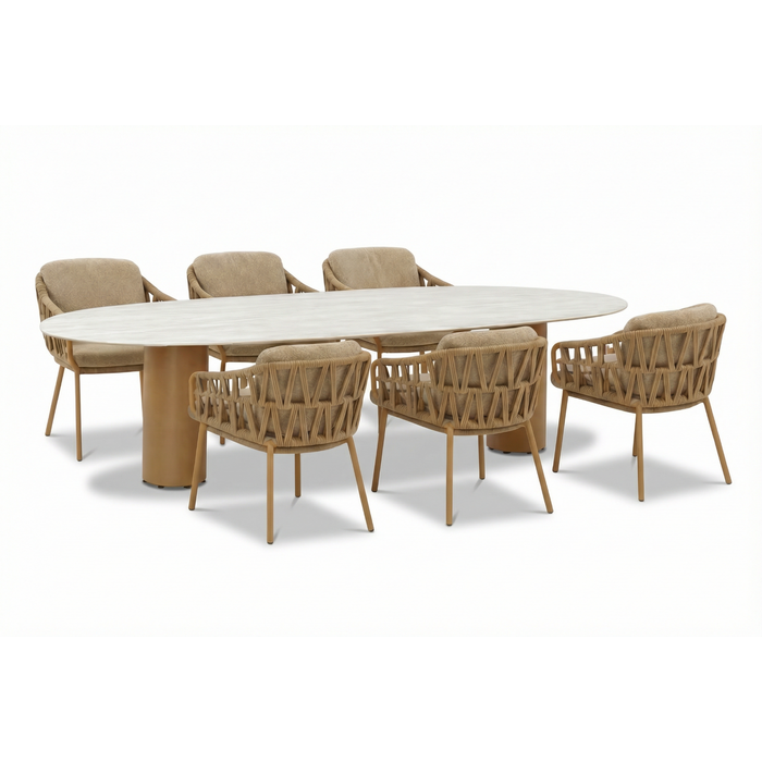 De 4 Seasons Outdoor Biarritz/Colorado dining tuinset 7-delig in de kleur amber is een luxe en stijlvolle blikvanger voor jouw terras. De warme amberkleurige accenten, het verfijnde rope vlechtwerk en het royale keramische tafelblad zorgen voor een moderne en elegante uitstraling.