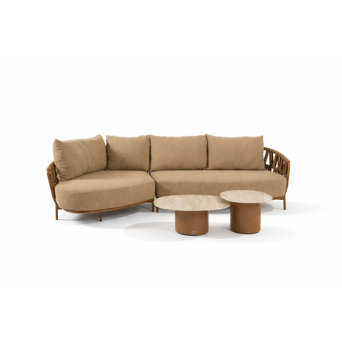 De ronde vormen sluiten perfect aan bij het organische design van de loungeset.