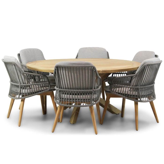 De Garden Collections Sand City dining tuintafel 160 cm rond is een stoere en degelijke teakhouten tuintafel uit de collectie van Tuinmeubelshop. Het dikke tafelblad en robuuste frame maken dit tot een juweel van een tuintafel. De tuintafel heeft een origineel pootstel dat voor een unieke uitstraling zorgt. De tuintafel is gemaakt van duurzaam teakhout afkomstig van gecertificeerde plantages uit Indonesië. De tuintafel is voorzien van het Indonesian Legal Wood® label, wat betekent dat het teakhout een duurzame afkomst heeft. De Garden Collections Sand City dining tuintafel 160 cm rond is een royale 6-persoons tuintafel. Het teakhout is behandeld met een Old Teak Greywash finish, wat de tafel een stoere en tijdloze uitstraling geeft. De stoere uitstraling van deze tuintafel uit zich na verloop van tijd in de natuurlijke werking van het teakhout, zoals kleine haarscheurtjes en vergrijzing. Je kunt ervoor kiezen om de tuintafel volledig te laten vergrijzen of op de kleur te behouden zoals de tuintafel uit de verpakking komt. Hiervoor zijn de speciaal ontwikkelde Garden Collections onderhoudsproducten beschikbaar. De Garden Collections Sand City tuintafel is voorzien van een stevig pootstel, wat ervoor zorgt dat de tuintafel altijd stabiel staat. Het is mogelijk om de tuintafel het hele jaar buiten te laten staan. Wij adviseren je om de teakhouten tuinmeubelen niet af te dekken met een afdekhoes.