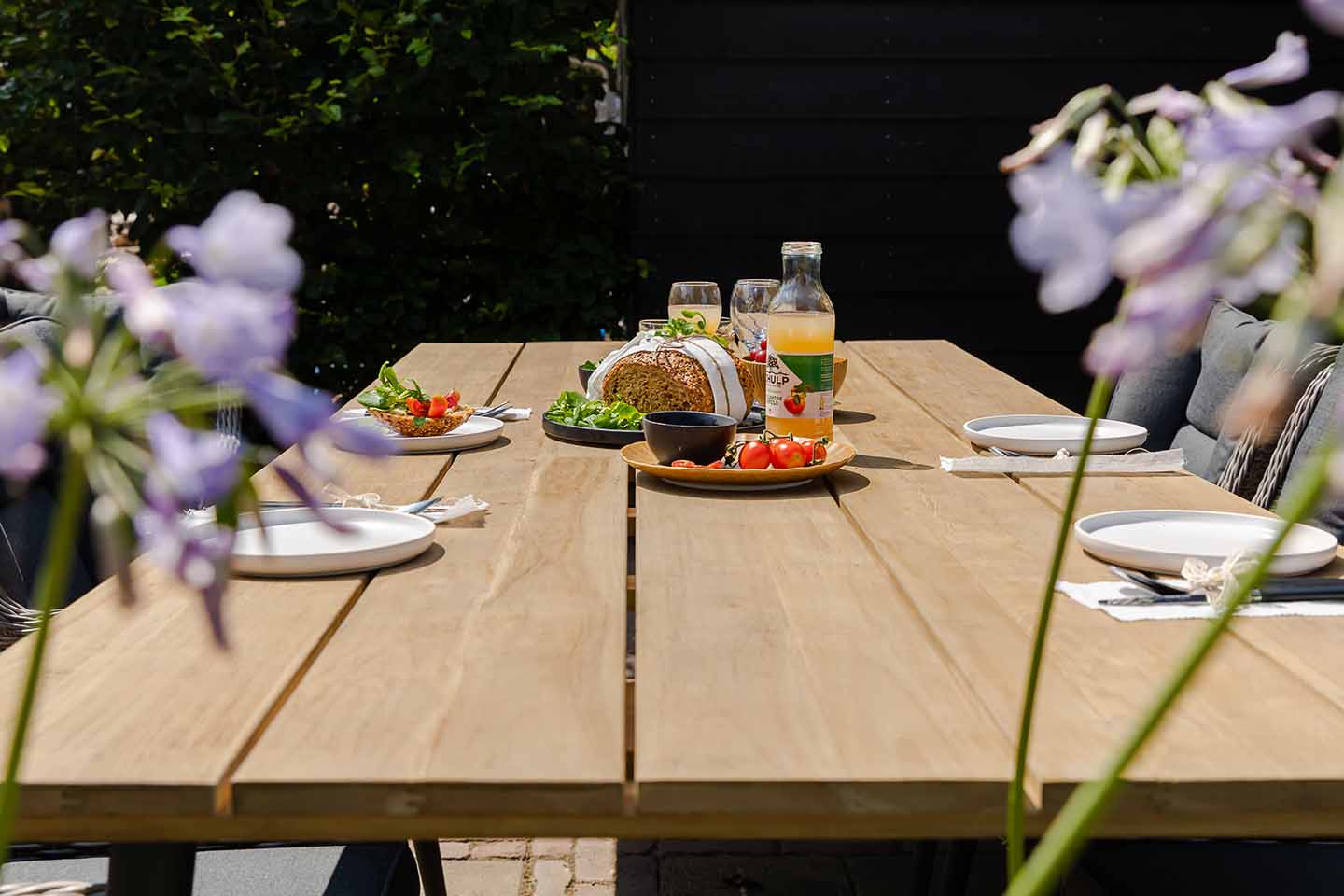 - Gebruik altijd onderzetters onder glazen op de buitentafel. Hiermee voorkom je vochtkringen in het hout.