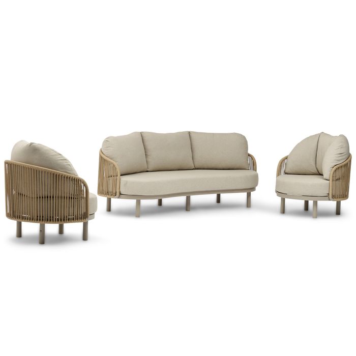 Geniet van het buitenleven met deze trendy loungeset uit de collectie van Tuinmeubelshop. De Coco Amici loungeset is een nieuwkomer in ons aanbod en heeft een eigentijds en zeer toonaangevend ontwerp. De royale 3-zits loungebank en twee comfortabele loungestoelen met afgeronde vormen, zandkleurig rope en zachte beige kussens brengen direct een luxe, warme sfeer in jouw tuin. Dankzij het aluminium frame en het weerbestendige wicker/rope materiaal is deze loungeset ideaal voor jarenlang loungeplezier. Je kunt de Coco Amici elementen ook eenvoudig combineren met andere tuinmeubelen. Creëer jouw perfecte buitenruimte online of bezoek een van onze megastores bij jou in de buurt om je eigen droom loungeset samen te stellen.