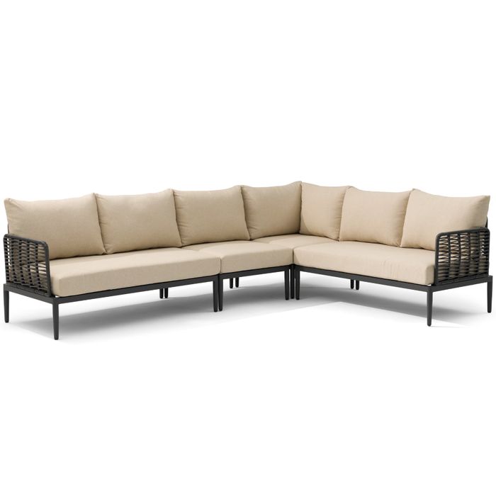 De Coco Ibiza loungeset is gemaakt van hoogwaardige, weerbestendige materialen. Het frame is vervaardigd uit gepoedercoat aluminium, wat licht van gewicht, stevig en roestbestendig is. De zijkanten van de open banken zijn afgewerkt met rope, een stijlvol en duurzaam materiaal dat een warme en luxe uitstraling geeft. De dikke kussens zijn uitgevoerd in waterafstotend textiel en bieden optimaal zitcomfort. De neutrale antracietkleur en strakke lijnen maken de Coco Ibiza loungeset een tijdloze toevoeging aan elke buitenruimte.