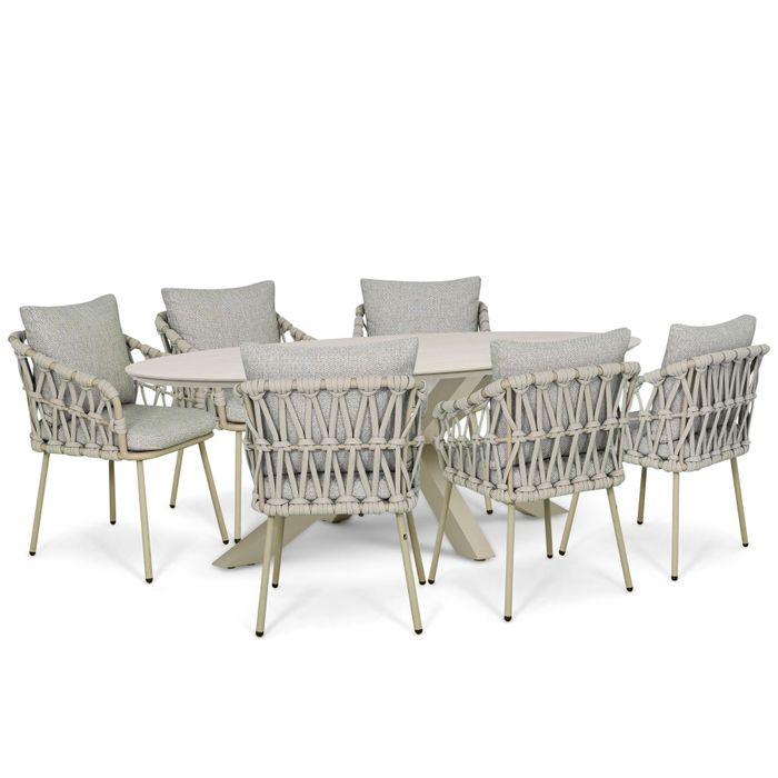 De Coco Oliva/Lunea 240x120 cm dining tuinset 7-delig is een royale en moderne tuinset met een warme, natuurlijke uitstraling. De combinatie van zes comfortabele Coco Oliva diningstoelen en de stijlvolle Coco Lunea ovale diningtafel van 240 x 120 cm maakt deze set tot een echte blikvanger op ieder terras.