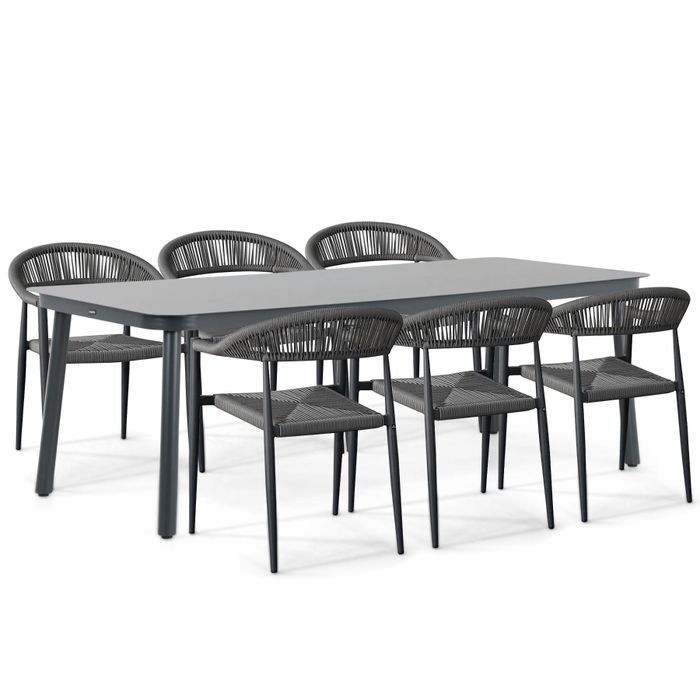 De De Laan Granada/Tavano 220x90 cm dining tuinset 7-delig is een royale en moderne tuinset met een uitstekende prijs-kwaliteitverhouding. De combinatie van antraciet aluminium, antraciet kunststof rope en een sterk keramisch gehard glazen tafelblad zorgt voor een onderhoudsvriendelijke en stijlvolle eetplek voor zes personen.