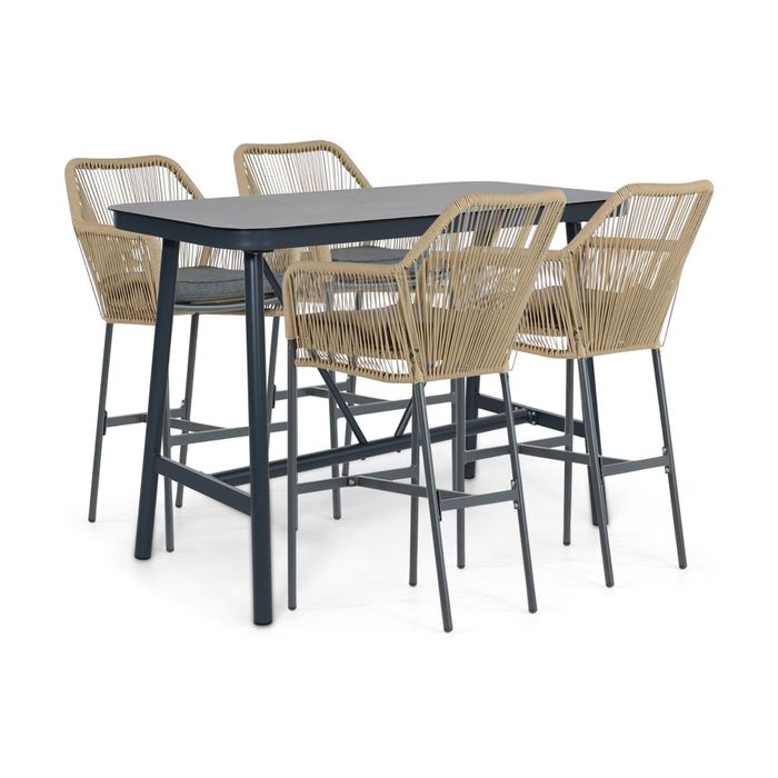 De De Laan Marbella/Tavano 150x75 cm barset 5-delig in antraciet is een moderne en krachtige barset met een stoere uitstraling. De combinatie van het warme rope vlechtwerk met het strakke antraciet aluminium onderstel zorgt voor een eigentijdse uitstraling die perfect past in een moderne tuin of onder een veranda.