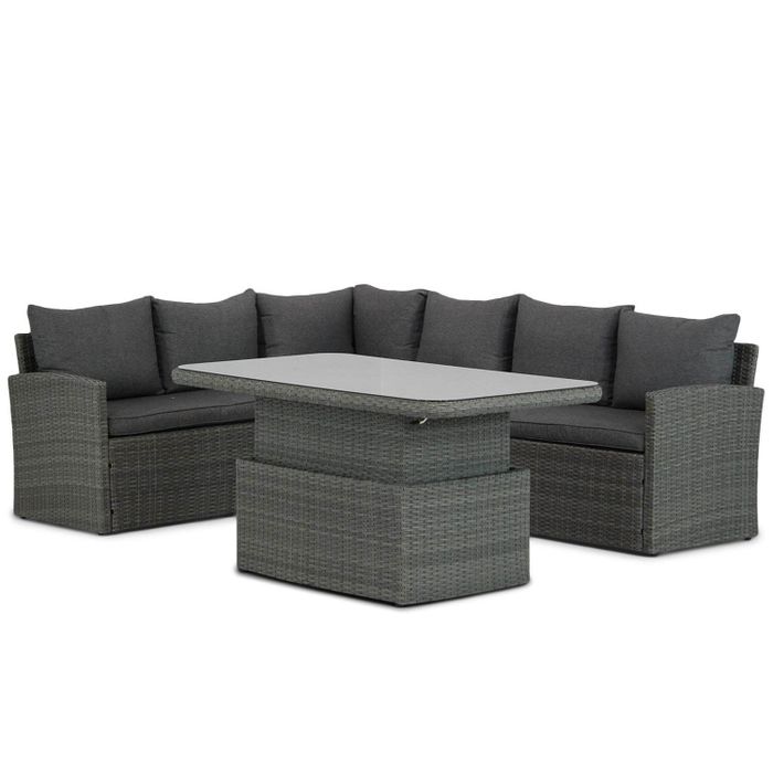 Lekker met z'n allen van het buitenleven genieten? Dat kan uitstekend in de Domani Athens hoek loungeset. Deze scherp geprijsde hoek loungeset heeft een uitstekende prijs-kwaliteit verhouding. Met de Domani Athens hoek loungeset wordt het wel heel voordelig buitenzitten! De hoek loungeset is uitgevoerd met een verstelbare hoge loungetafel. Deze tafel kan zowel als lage loungetafel of als eettafel worden gebruikt.