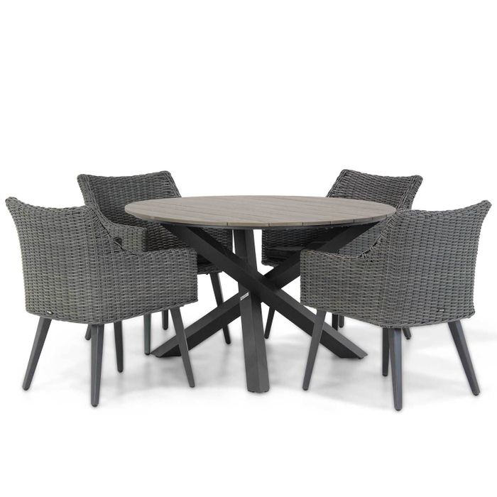 <h2>Garden Collections Milton/Ancona 125 cm rond dining tuinset 5-delig </h2> <p>Heerlijk genieten van het zomerweer in een prachtige tuinstoel? Dat kan in de Garden Collections Milton dining tuinstoel. De Milton tuinstoel in de kleur off black vormt samen met de Lifestyle Ancona ronde diningtafel van 125 cm een eigentijds en comfortabel tuinset met een tijdloze uitstraling. Doordat de eetstoel voorzien is van een zitkussen, ontstaat een optimaal zitcomfort. Een heerlijk tuinmeubelen set om aan te eten of gezellig een spelletje aan te doen. Het is ook mogelijk om je eigen tuinmeubelset samen te stellen uit onze grote collectie tuinmeubelen. Kom gerust een beetje inspiratie opdoen in één van onze sfeervolle megastores in de buurt! </p> <p>De Garden Collections Milton/Ancona 125 cm rond dining tuinset 5-delig bestaat uit: </p> <ul> <li>4 x Garden Collections Milton dining tuinstoel off black </li> <li>1 x Lifestyle Ancona dining tuintafel rond 125 cm</li> </ul> <h2>Eigenschappen Garden Collections Milton dining tuinstoel off black </h2> <p>De fraai gevormde aluminium poten geven een strakke uitstraling aan deze comfortabele tuinstoel van wicker. Deze buitenstoel is uitstekend te combineren met de vele tuintafels van Tuinmeubelshop. De eetstoel is gemaakt van halfrond wicker. De vlechtdraden hebben een ‘mono core’ productieproces, waardoor de draden door en door gekleurd zijn. Hierdoor zijn de kunststof vlechtdraden kleurecht en weerbestendig. Het vlechtdraad in de kleur off black geeft deze stoel voor buiten een tijdloze uitstraling en de kleur is met veel verschillende materialen te combineren. Het frame is gemaakt van aluminium, wat als belangrijke eigenschap heeft dat het nooit kan roesten. Dit zorgt ervoor dat de stoel en tafel een duurzaam product is. De diningstoel kan het gehele jaar door buiten staan. Ook is er onder de eetstoel een verstevigingsraster aangebracht, wat zorgt dat je lichaam optimaal wordt ondersteund. De buitenstoel is standaard uitgevoerd met een goed gevuld zitkussen. Het zitkussen is afritsbaar en de is koud wasbaar. Onder de stoel voor buiten zijn slijtdoppen aangebracht, zodat de tuinstoel makkelijk verschoven kan worden.  </p> <h2>Eigenschappen Lifestyle Ancona dining tuintafel rond 125 cm </h2> <p lang="NL-NL">De diningtafel is een eettafel met een aluminium spinpoot en een blad wat gemaakt is van polywood planken. Polywood is een kunststof samenstelling, wat ervoor zorgt dat de tuintafel licht van gewicht is en volledig weerbestendig. Het blad heeft een houtstructuur, zodat je de look krijgt van hout, met de voordelen van kunststof. De spinpoot, ook wel matrixpoot genoemd, is van gepoedercoat aluminium. Dit zorgt ervoor dat het pootstel kras- en stootvast is. Door de combinatie van deze materialen kan de diningtafel het hele jaar in je tuin blijven staan. De buitentafel kan met een mild schoonmaakmiddel gereinigd worden. Wil je polywood beschermen? Dan kun je het beste een polywood protector en een polywood cleaner gebruiken. Deze onderhoudsproducten zijn speciaal samengesteld om bij te dragen aan de lange levensduur van het materiaal. Wanneer je de polywood protecor gebruikt, zal het vuil zich niet hechten en krijg je minder snel vlekken op het tuintafelblad. De ronde buitentafel heeft plaats voor vier tuinstoelen, het is mogelijk een andere stoel te combineren bij deze tafel! </p>
