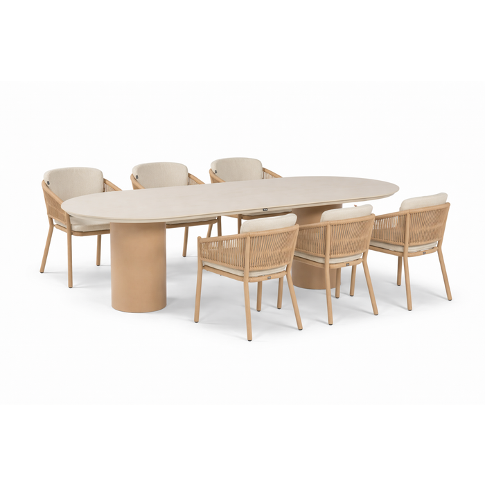 De Valencia is een royale dining tuintafel met een modern ovale vorm en een elegante dubbele kolompoot. Het blad is uitgevoerd in een licht crèmekleurige, matte toplaag, die oogt als een luxe steen- of betonlook, maar in werkelijkheid gemaakt is van een onderhoudsvriendelijk en volledig weerbestendig materiaal, zoals keramiek op glas of hoogwaardig composiet. Dit materiaal is krasvast, vormvast en eenvoudig te reinigen, terwijl het blad toch relatief licht in gewicht blijft. Zo profiteer je van de luxe uitstraling van natuursteen, met de praktische voordelen van een modern, weerbestendig tafelblad.