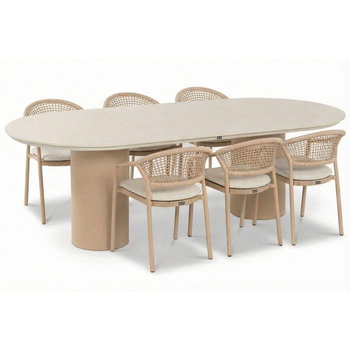 De Valencia is een royale diningtafel met een langwerpig ovaal blad van 220 x 100 cm, ondersteund door twee cilindervormige pilaren als pootstel. Het slanke blad in een zachte, beige/naturel tint geeft je terras een moderne, designvolle uitstraling. Het blad is uitgevoerd in een weerbestendig, onderhoudsvriendelijk materiaal (zoals gecoat composiet/keramiek-look), wat ervoor zorgt dat de tuintafel licht van gewicht is en volledig weerbestendig. Het blad heeft een subtiele, matte uitstraling, zodat je de look krijgt van een stijlvolle indoor design tafel, met de voordelen van duurzaam buitentafel-materiaal.
