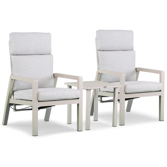 De ergonomisch ontworpen stoelen bieden optimaal zitcomfort, zodat je heerlijk kunt ontspannen. De bijzettafel is compact en biedt genoeg ruimte voor een drankje, een boek of decoratieve items. Het strakke en tijdloze design van de set past moeiteloos in verschillende tuin- en terrasstijlen.