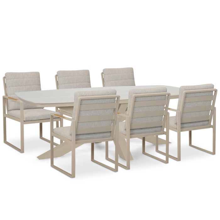 Met een lengte van 220 cm biedt deze tuinset volop ruimte voor lange zomeravonden, diners met vrienden en gezellige familiemomenten. De lichte aluminium frames in combinatie met het strakke ceramic stone blad geven de set een elegante, rustige uitstraling die perfect past in moderne en minimalistische tuinen.