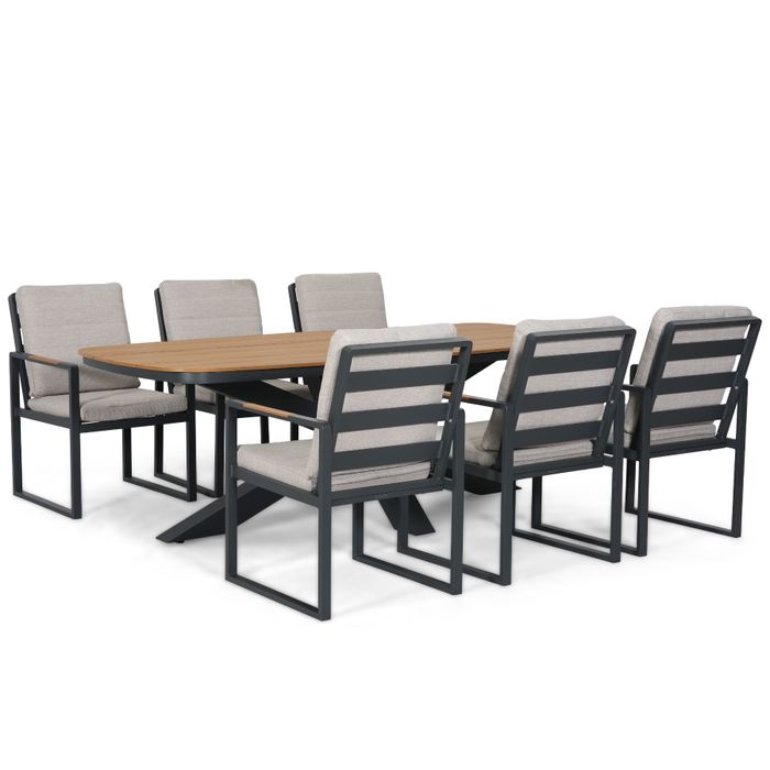 De Lifestyle Alessio/Camila 220x100 cm dining tuinset 7-delig is een ruime en moderne antraciet tuinset voor 6 personen. Deze luxe dining tuinset combineert zes stijlvolle Alessio dining tuinstoelen met de royale Camila dining tuintafel van 220x100 cm met een duurzaam polywood tafelblad.
