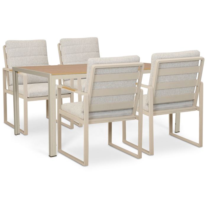 De Lifestyle Alessio/Creta 160x90 cm dining tuinset is een moderne en sfeervolle tuinset met een warme uitstraling. De combinatie van de comfortabele Alessio dining tuinstoelen in de kleur loft en de Creta dining tuintafel met natuurlijke houtlook zorgt voor een stijlvolle en uitnodigende setting in iedere tuin. Dankzij het ruimere formaat van de tafel heb je net wat extra plek, ideaal voor gezellige diners met familie en vrienden.