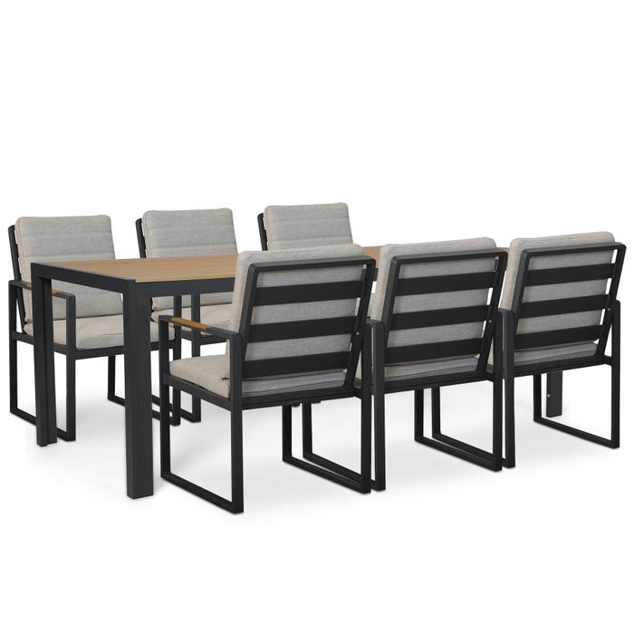 Het antraciet aluminium frame vormt een strak contrast met het warme houtlook polywood blad. Hierdoor ontstaat een tijdloos en modern geheel dat past bij zowel eigentijdse als meer klassieke tuininrichtingen.