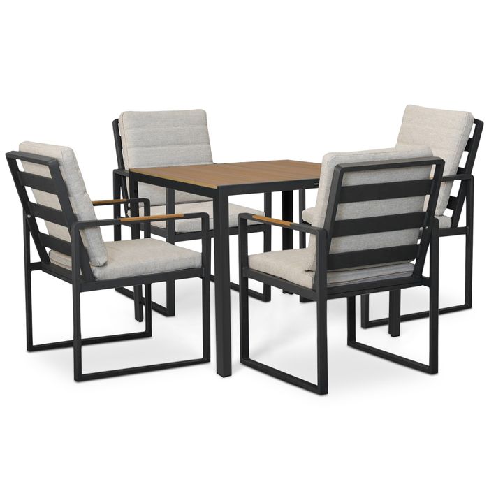 Dankzij het vierkante formaat is deze tuinset bijzonder geschikt voor kleinere terrassen, patio’s of beschutte zithoeken in de tuin. De rechte lijnen van het antraciet aluminium frame in combinatie met het warme houtlook blad zorgen voor een eigentijdse en sfeervolle uitstraling.