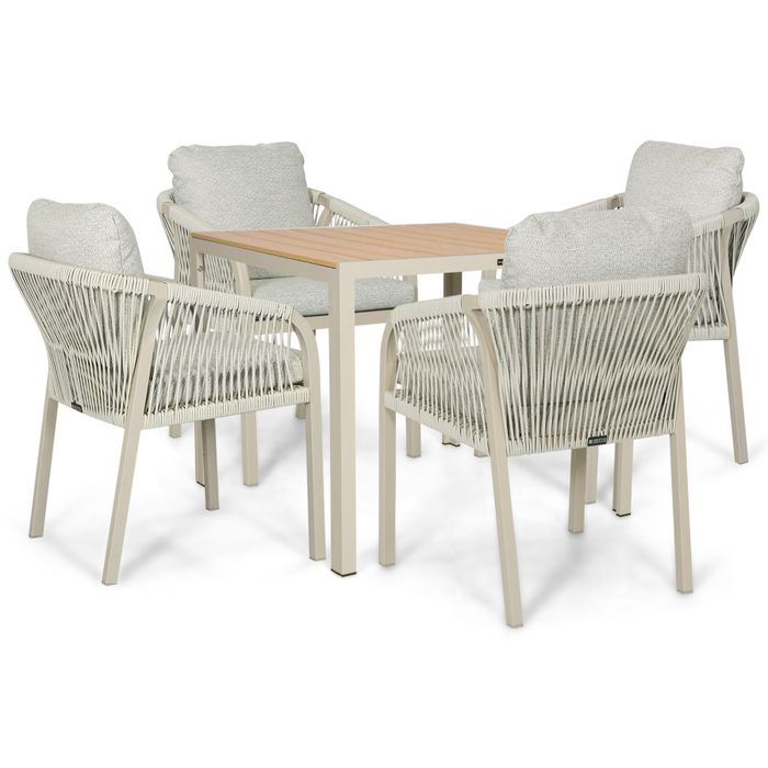 Geniet van het buitenleven met deze stijlvolle 5-delige dining tuinset uit de collectie van Tuinmeubelshop. De Lifestyle Biagio diningstoel is een eigentijdse rope tuinstoel met een luchtig design, heerlijk zitcomfort en een moderne uitstraling. Dit combineert perfect met de vierkante Lifestyle Creta 90x90 cm tuintafel met houtlook blad en strak aluminium frame. Dankzij het compacte formaat is deze tuinset ideaal voor een kleiner terras, balkon of knus hoekje in de tuin. Natuurlijk kun je de tafel en stoelen ook combineren met andere tuinmeubelen. Ontdek online de mogelijkheden of bezoek een van onze megastores om jouw eigen ideale tuinset samen te stellen.