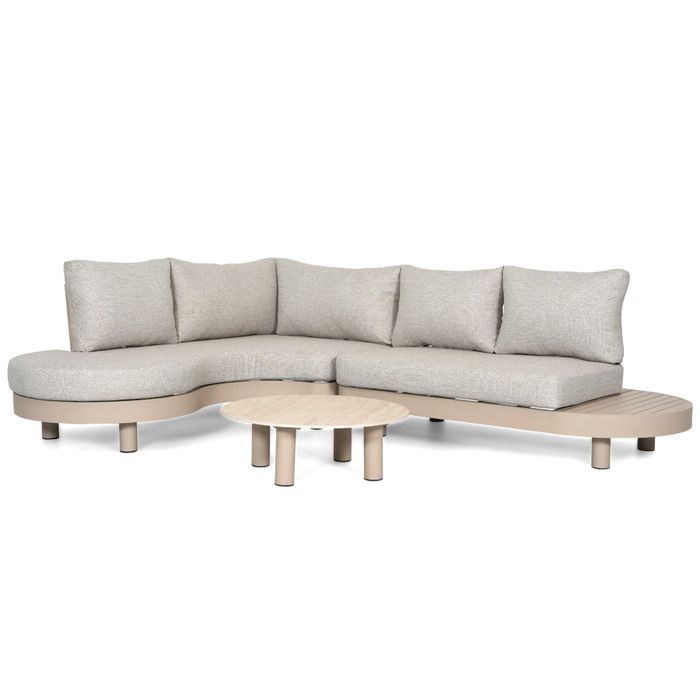 De korte, cilindervormige pootjes onder het platform zorgen voor een stabiele basis en zijn voorzien van beschermende doppen. Hierdoor is de loungeset gemakkelijk te verplaatsen op het terras en worden tegels of vlonderplanken beter beschermd tegen krassen. De losse rugkussens bieden optimaal comfort voor uren ontspannen loungen. Dankzij de afgeronde chaise longue aan één zijde kun je heerlijk languit liggen, terwijl het geïntegreerde plateau aan de andere zijde perfect is voor een boek, drankje of sfeervolle lantaarn.