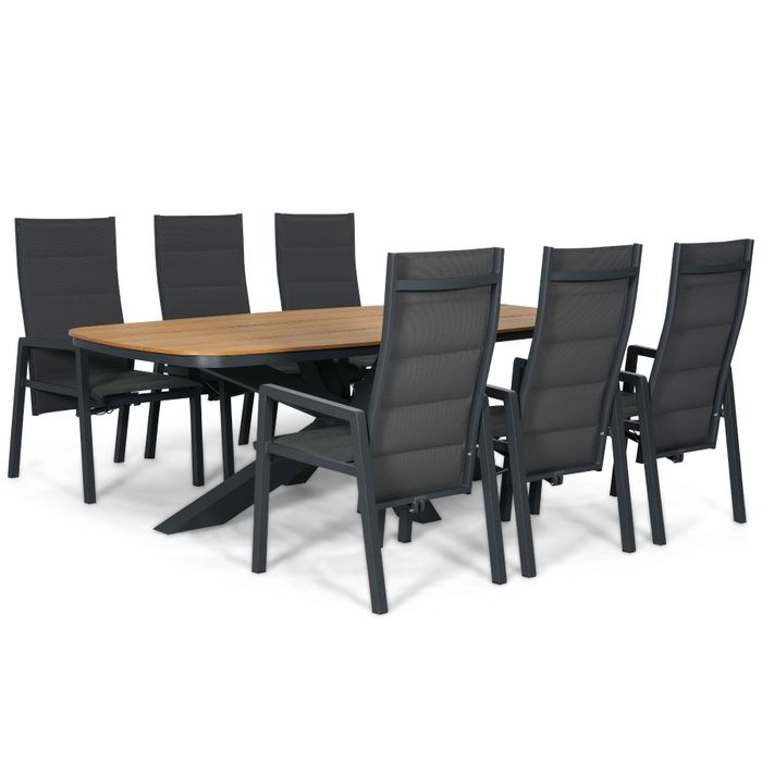 De combinatie van het donkere aluminium frame en het warme houtlook tafelblad zorgt voor een krachtig, eigentijds karakter. Ideaal voor grotere terrassen, veranda’s en strakke tuinen.