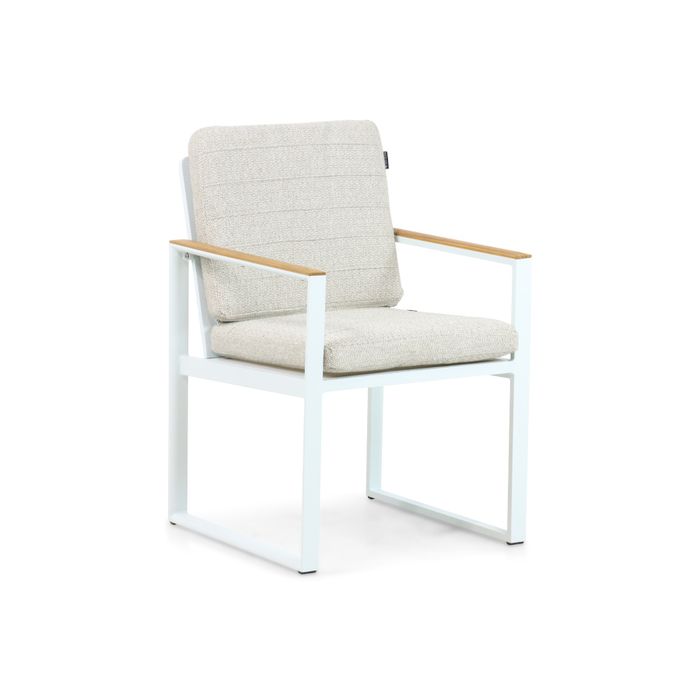 Het aluminium frame van de Faro dining tuinstoel is afgewerkt in een frisse witte kleur, wat zorgt voor een moderne en verfijnde uitstraling. Aluminium is bovendien lichtgewicht, roestvrij en eenvoudig schoon te maken, waardoor het perfect is voor buitengebruik. De Faro dining tuinstoel wordt geleverd met sandy kleurige zit- en rugkussens die niet alleen een stijlvol contrast vormen met het witte frame, maar ook een ongeëvenaard zitcomfort bieden. De kussens zijn gemaakt van weerbestendig materiaal en zijn eenvoudig te reinigen, wat zorgt voor gebruiksgemak. De armleuningen van de Faro dining tuinstoel zijn gemaakt van duurzaam teakhout, dat een natuurlijke touch toevoegt aan het moderne ontwerp. Het hout heeft een warme uitstraling en voelt comfortabel aan. Dankzij het strakke en tijdloze design is de Faro dining tuinstoel een veelzijdige keuze die in verschillende tuinstijlen past. Combineer hem met een tafel naar keuze en creëer een persoonlijke en uitnodigende buitenruimte.