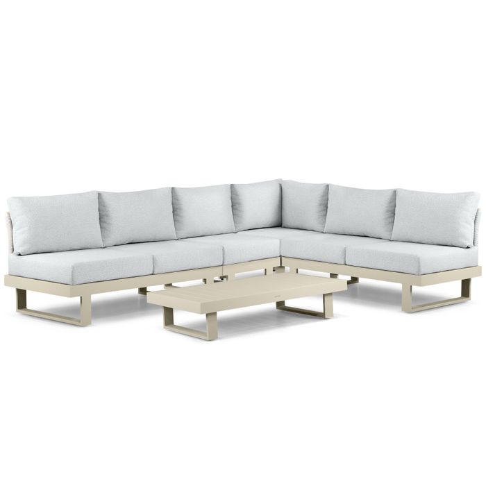 De Lifestyle Lorenzo hoek loungeset 5-delig biedt een perfecte balans tussen modern design, comfort en functionaliteit. Deze stijlvolle loungeset, uitgevoerd in loftkleurig aluminium en voorzien van luxe Softgrey All Weather kussens, past moeiteloos in elke tuin of op elk terras. De toevoeging van een rechthoekige loungetafel maakt deze set ideaal voor zowel ontspannen loungen als praktische functionaliteit. Met voldoende zitruimte en een tijdloos ontwerp is deze set een uitstekende keuze voor wie op zoek is naar luxe en gebruiksgemak. De Lifestyle Lorenzo loungeset is verkrijgbaar in diverse opstellingen en in drie kleuren, met kussens in meerdere kleuren en kwaliteiten, zodat u de set geheel naar uw eigen stijl kunt aanpassen. Bestel eenvoudig online of kom langs in een van de Tuinmeubelshop megastores, waar onze verkoopadviseurs u graag verder helpen.