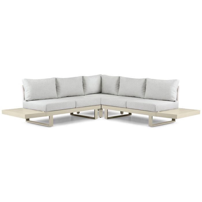 De Lifestyle Lorenzo hoek loungeset 5-delig is de perfecte combinatie van stijl, comfort en flexibiliteit. Met zijn moderne uitstraling en strakke lijnen voegt dit loungeset een luxe sfeer toe aan elke tuin of terras. De set bestaat uit hoogwaardige aluminium elementen en is afgewerkt met comfortabele earthkleurige kussens van premium Sundura-kwaliteit. De Lorenzo serie biedt volop mogelijkheden om uw set naar wens samen te stellen. Creëer een platform loungeset met aluminium tafeltjes of breid uw loungeset uit met een middenelement voor extra zitruimte. Dankzij de veelzijdigheid en het tijdloze design past de Lorenzo serie in elke buitenruimte. Met keuze uit drie moderne kleuren en diverse kussenvarianten kunt u de Lorenzo serie volledig afstemmen op uw persoonlijke voorkeuren. Bestel eenvoudig online of bezoek een Tuinmeubelshop Megastore om het set zelf te ervaren.