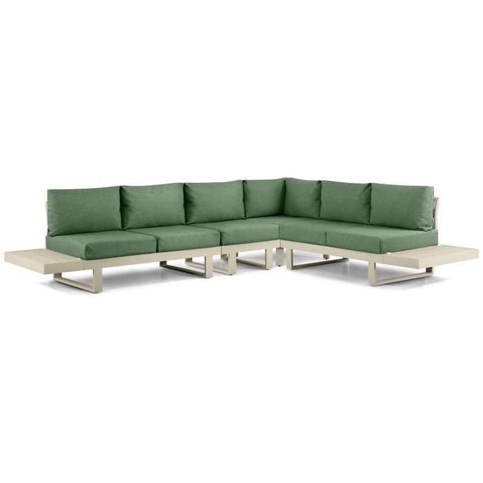 De Lifestyle Lorenzo hoek loungeset 6-delig in de kleur All Weather Moss Green biedt een stijlvolle en functionele oplossing voor jouw buitenruimte. Met twee open banken, een hoekmodule, een middenmodule en twee handige side tables combineert deze set modern design met optimaal comfort. Dankzij de hoogwaardige afwerking en volledig weerbestendige materialen is deze loungeset een perfecte keuze voor elk seizoen.