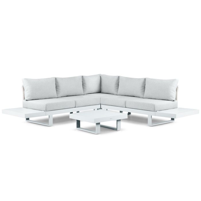 De twee side tables maken de set compleet en bieden extra gemak voor het plaatsen van hapjes, drankjes of decoratieve accessoires. De side tables zijn gemaakt van gepoedercoat aluminium, wat zorgt voor een duurzame en stijlvolle afwerking die bestand is tegen diverse weersomstandigheden.