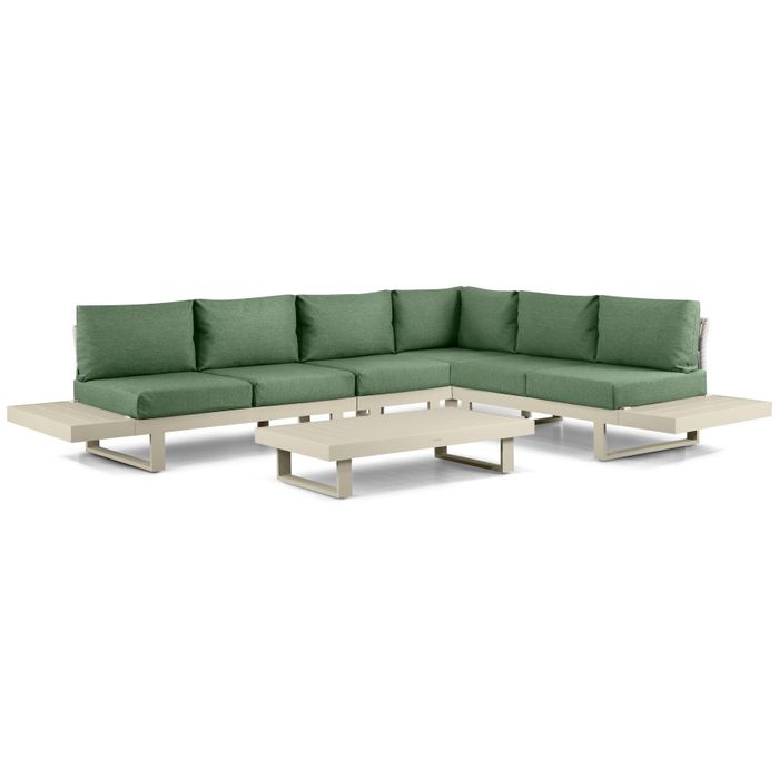 De Lifestyle Lorenzo hoek loungeset 7-delig - All Weather - Moss Green biedt alles wat je nodig hebt voor een stijlvolle en comfortabele buitenruimte. De set is volledig weerbestendig, onderhoudsvriendelijk en ontworpen om jarenlang plezier te bieden.