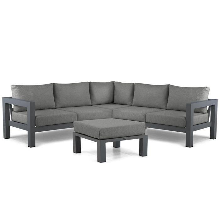 De Lifestyle Luca hoek loungeset 4-delig is de perfecte combinatie van modern design en ultiem comfort. Het strakke aluminium frame geeft de set een tijdloze uitstraling, terwijl de all-weather kussens in de kleur Dark Grey zorgen voor een luxe en comfortabele zitervaring. De toevoeging van een voetenbank maakt deze set extra veelzijdig: gebruik hem als extra zitplek, een comfortabele verlenging om heerlijk te loungen, of zelfs als bijzettafel. Of je nu ontspant in de zon of geniet van een gezellige avond met vrienden, deze loungeset past perfect in elke buitenruimte.