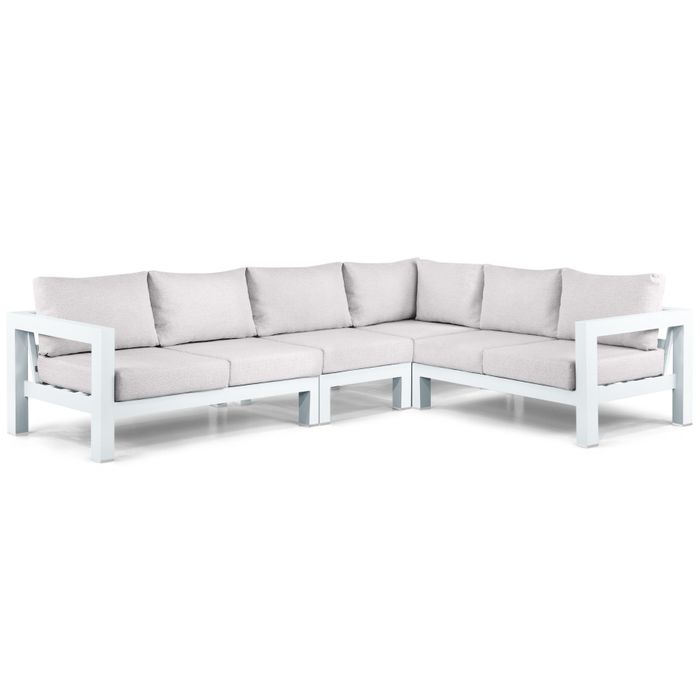 De Lifestyle Luca hoek loungeset 4-delig combineert een strak en modern design met ultiem comfort. Het witte aluminium frame geeft de set een frisse en luxe uitstraling, terwijl de Sundura Sandy kussens zorgen voor een warme en natuurlijke sfeer. Dankzij de toevoeging van een middenmodule biedt deze set extra zitruimte en flexibiliteit, zodat je de opstelling eenvoudig kunt aanpassen aan jouw terras of tuin. Of je nu ontspant met een goed boek of een gezellige avond met vrienden beleeft, deze loungeset biedt het perfecte comfort.