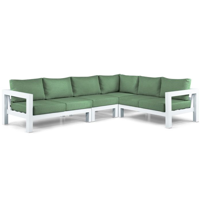 De Lifestyle Luca hoek loungeset 4-delig is een stijlvolle en comfortabele toevoeging aan jouw tuin of terras. Het witte aluminium frame zorgt voor een frisse en moderne uitstraling, terwijl de all-weather kussens in de kleur Moss Green een natuurlijke en rustgevende sfeer creëren. Dankzij de toevoeging van een middenmodule biedt deze loungeset extra zitruimte en flexibiliteit, zodat je de opstelling eenvoudig kunt aanpassen aan jouw buitenruimte. Of je nu ontspant in de zon of geniet van een gezellige avond met vrienden, deze set biedt het ultieme loungecomfort.
