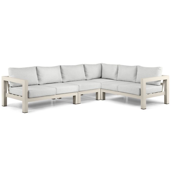 De Lifestyle Luca hoek loungeset 4-delig combineert modern design met ultiem comfort en flexibiliteit. Het aluminium frame in de kleur Loft zorgt voor een stoere en eigentijdse uitstraling, terwijl de Sundura Earth kussens de set een warme en natuurlijke uitstraling geven. Dankzij de toevoeging van een middenmodule biedt deze loungeset extra zitruimte en kun je de opstelling eenvoudig aanpassen aan jouw terras of tuin. Of je nu ontspant met een goed boek of een gezellige avond met vrienden beleeft, deze loungeset biedt het perfecte comfort.