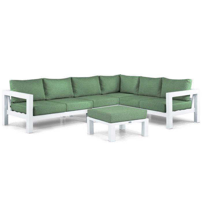 De Lifestyle Luca hoek loungeset 5-delig combineert luxe, comfort en flexibiliteit in een stijlvol ontwerp. Het witte aluminium frame geeft de set een frisse en moderne uitstraling, terwijl de all-weather kussens in de kleur Moss Green zorgen voor een natuurlijke en rustgevende sfeer. Dankzij de toevoeging van zowel een middenmodule als een voetenbank biedt deze loungeset extra zit- en ligruimte, zodat je optimaal kunt ontspannen en genieten van jouw tuin of terras. Of je nu languit wilt loungen of een gezellige avond met vrienden beleeft, deze set past perfect in elke buitenruimte.