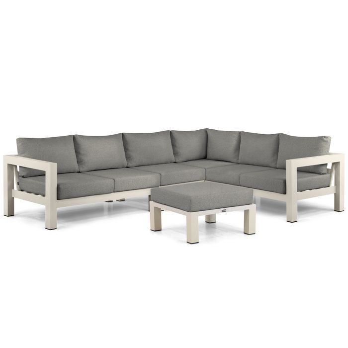 De Lifestyle Luca hoek loungeset 5-delig is de perfecte combinatie van modern design, luxe en flexibiliteit. Het aluminium frame in de kleur Loft geeft de set een stoere en eigentijdse uitstraling, terwijl de all-weather kussens in de kleur Dark Grey een stijlvolle en tijdloze look bieden. Dankzij de toevoeging van zowel een middenmodule als een voetenbank biedt deze loungeset extra zit- en ligruimte, zodat je optimaal kunt ontspannen en genieten van jouw tuin of terras. Of je nu languit wilt loungen of een gezellige avond met vrienden beleeft, deze set past perfect in elke buitenruimte.