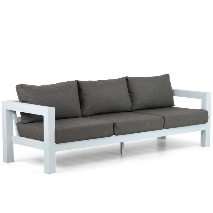 De Lifestyle Luca loungeserie is uitgevoerd met een aluminium frame in de kleur wit, wat zorgt voor een moderne uitstraling en praktische voordelen zoals licht gewicht en onderhoudsvrij gebruik. Het aluminium is afgewerkt met een duurzame poedercoating, een proces waarbij poeder elektrostatisch op het frame wordt aangebracht en vervolgens verhit in een oven. Tijdens dit proces worden de poederdeeltjes vloeibaar, stroperig en uiteindelijk uitgehard tot een sterke beschermlaag die het frame langdurig beschermt tegen slijtage en weersinvloeden. De loungeserie wordt geleverd met luxe all-weather loungekussens die dankzij een speciale coating vuil- en vochtafstotend zijn. Deze goedgevulde kussens bieden optimaal zitcomfort en blijven lang mooi, zeker wanneer je ze jaarlijks behandelt met een textielbeschermer. Voor een persoonlijke touch kun je kiezen uit verschillende kussenkleuren: dark grey voor een stoere uitstraling, soft grey voor een tijdloze look, of moss green voor een frisse, natuurlijke sfeer. De Lifestyle Luca loungeserie combineert duurzaamheid, stijl en comfort, ideaal voor een uitnodigende tuin of terras.