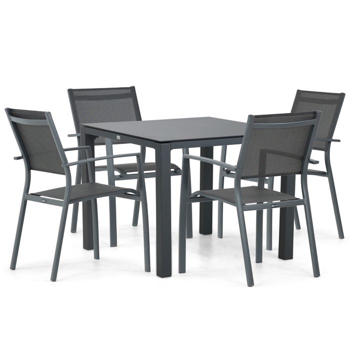 Breng stijl en comfort naar jouw tuin met de Lifestyle Sella diningstoelen en de compacte Mateo dining tuintafel van 90 x 90 cm. Deze moderne tuinset biedt plaats aan vier personen en is perfect voor een intiem diner of een ontspannen moment in de buitenlucht. De Mateo dining tuintafel, met zijn stevige aluminium frame en krasbestendig HPL-tafelblad, is onderhoudsvriendelijk en ontworpen voor jarenlang gebruik. De Lifestyle Sella diningstoelen, met een aluminium frame en een rug- en zitgedeelte van textileen, voegen een eigentijdse uitstraling en hoog zitcomfort toe aan de set. Kom deze prachtige tuinset zelf ervaren in een van onze 12 Tuinmeubelshop XXL Experience Stores!