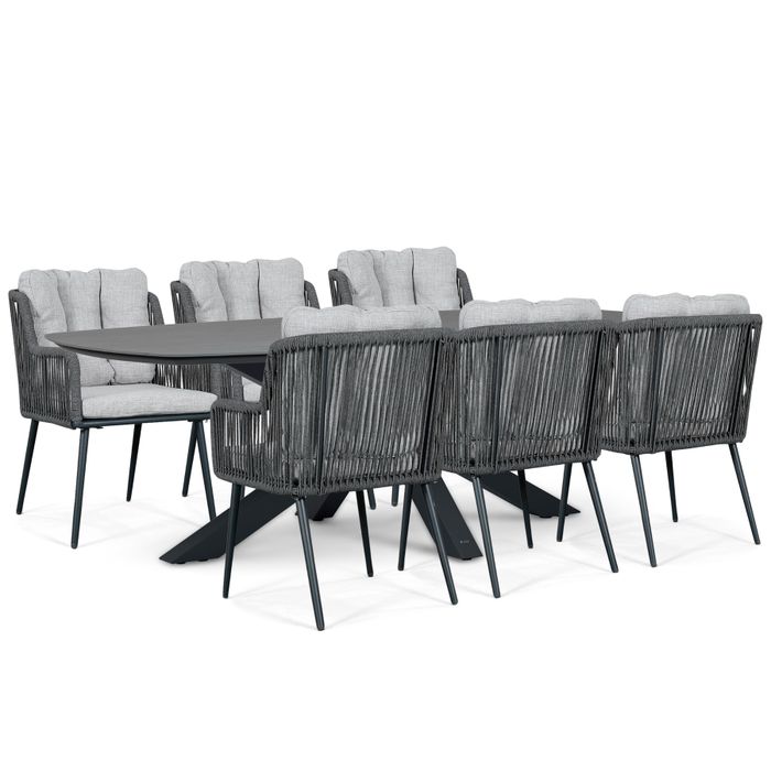 Kies voor een krachtige en moderne uitstraling met de Lifestyle Tivoli/Voyage 240x120 cm dining tuinset 7-delig in antraciet. Deze luxe dining tuinset combineert zes stijlvolle Tivoli diningstoelen met de elegante Voyage tafel van 240 x 120 cm in Deens ovale vorm. De diepe antracietkleur in combinatie met de lichtgrijze kussens zorgt voor een sterk, eigentijds contrast dat perfect past in een moderne tuin.