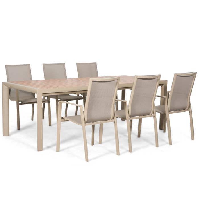 De Lifestyle Ultimate/Allungo dining tuinset 7-delig in loft (zandkleur) is een stijlvolle en moderne tuinset met een lichte, warme uitstraling. De combinatie van de comfortabele Ultimate dining stoelen en de uitschuifbare Allungo dining tuintafel zorgt voor optimaal gebruiksgemak en flexibiliteit.