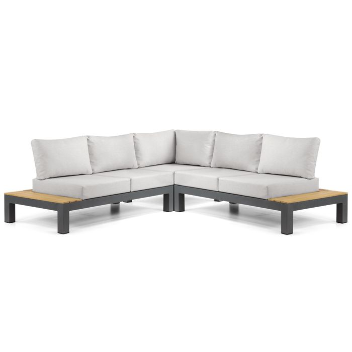 De Lifestyle Vittoria loungeset is ontworpen met een sterk aluminium frame dat gepoedercoat is voor een strak en weerbestendig resultaat. Het frame is licht van gewicht en onderhoudsarm, terwijl de houten zijpanelen van hoogwaardig teakhout een warme en natuurlijke uitstraling toevoegen. Het teakhout is afkomstig van gecertificeerde plantages en behandeld voor optimale bescherming tegen weersinvloeden, zodat het hout lang mooi blijft.