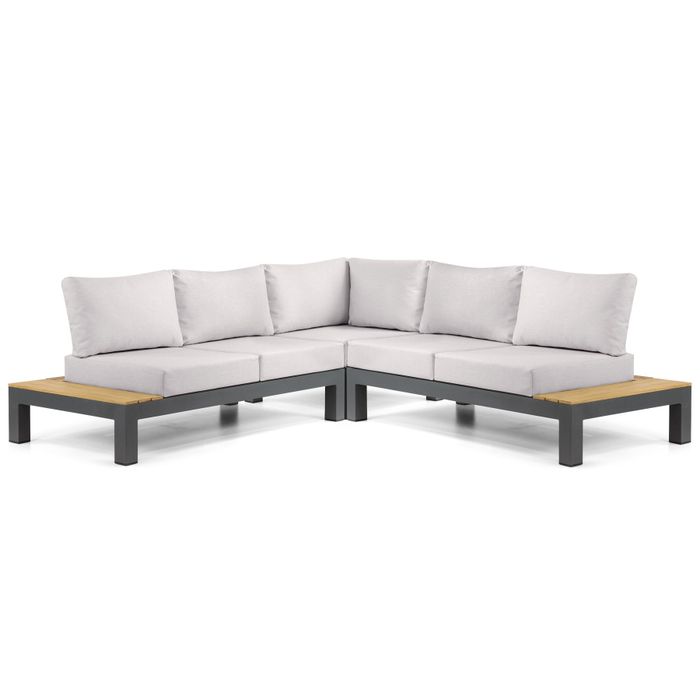 De Lifestyle Vittoria loungeset is ontworpen met een aluminium frame dat is gepoedercoat, waardoor het frame licht van gewicht, sterk en volledig weerbestendig is. De teakhouten zijpanelen, vervaardigd van duurzaam hout afkomstig van gecertificeerde plantages, voegen een warme en natuurlijke uitstraling toe aan het strakke design. Het hout is behandeld om bestand te zijn tegen weersinvloeden en behoudt zijn schoonheid, zelfs na jaren van gebruik.