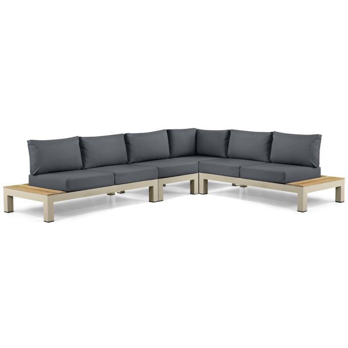 De Lifestyle Vittoria hoek loungeset 4-delig is een perfecte combinatie van modern design, luxe en flexibiliteit. Het aluminium frame in de kleur Loft, afgewerkt met stijlvol teakhout, geeft de set een warme en eigentijdse uitstraling. De Sundura Carbon kussens zorgen voor een luxe contrast en maken deze loungeset tot een echte blikvanger in jouw tuin of op jouw terras. Dankzij de toevoeging van een middenmodule biedt deze loungeset extra zitruimte en kun je de opstelling eenvoudig aanpassen aan jouw buitenruimte.
