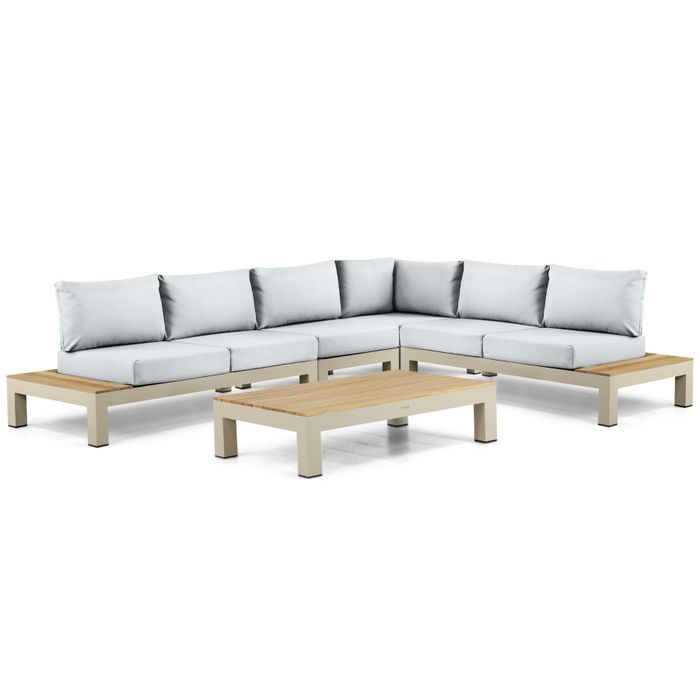 De Lifestyle Vittoria hoek loungeset 5-delig biedt de perfecte combinatie van luxe, comfort en functionaliteit. Het aluminium frame in de kleur Loft, afgewerkt met hoogwaardig teakhout, zorgt voor een warme en eigentijdse uitstraling. De all-weather kussens in de kleur Soft Grey geven de set een frisse en stijlvolle look, terwijl de toevoeging van zowel een middenmodule als een rechthoekige loungetafel extra ruimte en gebruiksgemak biedt. Of je nu heerlijk wilt loungen of een gezellige avond met vrienden beleeft, deze loungeset past perfect in elke buitenruimte.