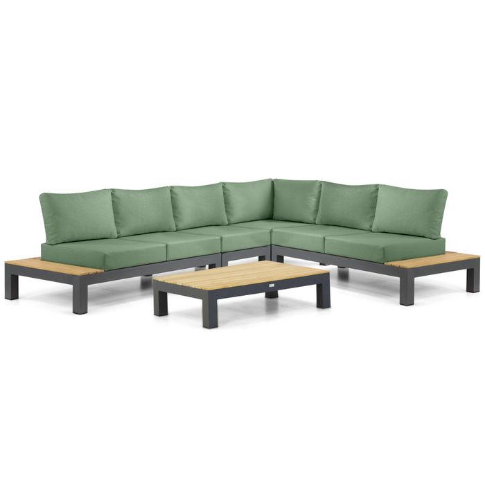 Creëer een luxe en stijlvolle loungehoek in je tuin met de Lifestyle Vittoria hoek loungeset 5-delig. Deze moderne loungeset combineert comfort en design met hoogwaardige materialen zoals aluminium en teakhout. De strakke vormgeving en warme houtaccenten geven de set een eigentijdse uitstraling, terwijl de royale kussens zorgen voor een ultieme lounge-ervaring. Dankzij de All Weather kussens in de kleur Moss Green geniet je zorgeloos van lange zomeravonden, ongeacht het weer. Ontdek deze prachtige loungeset in één van onze 12 Experience Stores XXL en ervaar het comfort zelf!