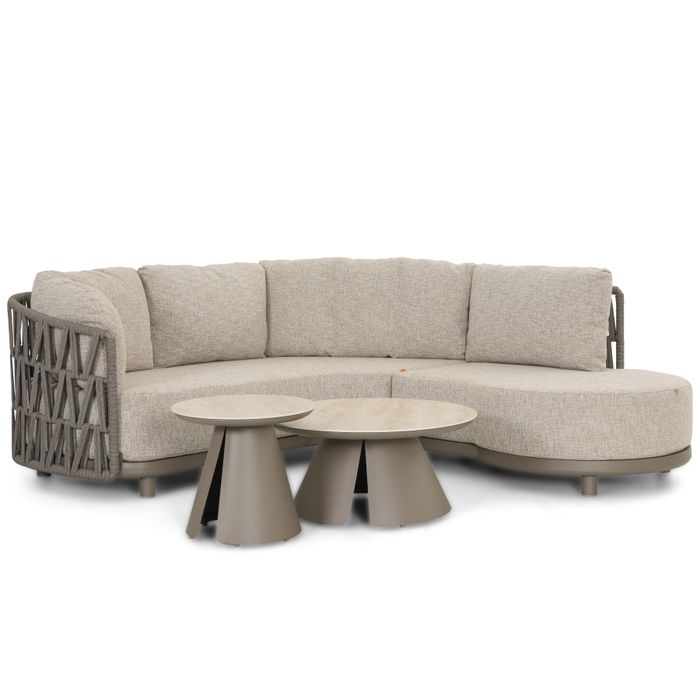 De Cayora loungebank valt direct op door de organische vormgeving: een royale gebogen lounge met geïntegreerde chaise, ideaal om languit te relaxen. De zitting en rugkussens zijn rijk gevuld voor optimaal comfort, zodat je uren ontspannen van jouw tuin, terras of veranda geniet. De kussens zijn uitgevoerd in een taupe-naturel/zandkleurige, grof geweven outdoor stof met een luxe uitstraling en voelen zacht maar stevig aan. De doorlopende zitkussens zorgen voor een strak geheel, zonder storende naden of losse delen.