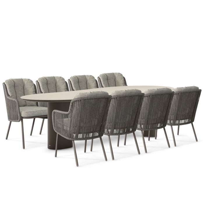 De organisch gevormde tafel met zandkleurig blad geeft de set een zachte, verfijnde uitstraling. Dankzij de lengte van 300 cm is er volop ruimte voor grote gezelschappen en lange zomeravonden vol gezelligheid.