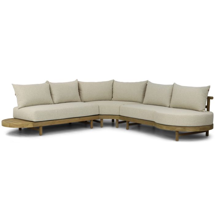 De Santika Kayu loungeset is volledig vervaardigd uit teakhout, een materiaal dat bekend staat om zijn duurzaamheid en weerbestendigheid. Het warme karakter van teakhout geeft de set een tijdloze uitstraling die naadloos aansluit bij verschillende tuinstijlen. Het unieke ontwerp met ronde vormen en een praktische hoekopstelling creëert een gezellige en uitnodigende sfeer, ideaal voor zowel grote als kleine buitenruimtes.