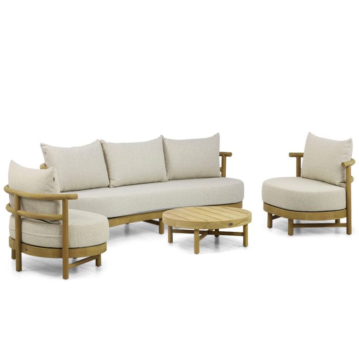 De Santika Kayu stoel-bank loungeset combineert stijl, comfort en hoogwaardige materialen in één elegante set. Deze 4-delige loungeset, bestaande uit twee comfortabele loungefauteuils, een ruime 3-zits loungebank en een praktische loungetafel, is de ideale keuze om jouw tuin of terras mee in te richten. De set is volledig vervaardigd uit duurzaam teakhout en voorzien van zandkleurige kussens die zorgen voor een warme, natuurlijke uitstraling. Het tijdloze design en de royale opstelling maken deze loungeset perfect voor zowel ontspanning als gezelligheid. Kom deze luxe loungeset zelf ervaren in een van onze 12 Tuinmeubelshop XXL Experience Stores!