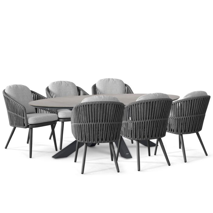 De Santika Marani/Lunea 240x120 cm dining tuinset 7-delig is een luxe en royale dining set met een krachtige moderne uitstraling. De combinatie van zes elegante Marani diningstoelen in antraciet en de ovale Lunea diningtafel van 240x120 cm zorgt voor een stijlvolle, ruimtelijke opstelling.