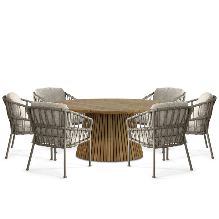 De Santika Miyora/Fungo 180 cm dining tuinset 7-delig is een exclusieve en sfeervolle dining set met een warme Japandi uitstraling. De combinatie van zes luxe Miyora diningstoelen in mocha kleur en de ronde Fungo diningtafel van 180 cm zorgt voor een uitnodigende en harmonieuze setting in jouw tuin of op het terras.